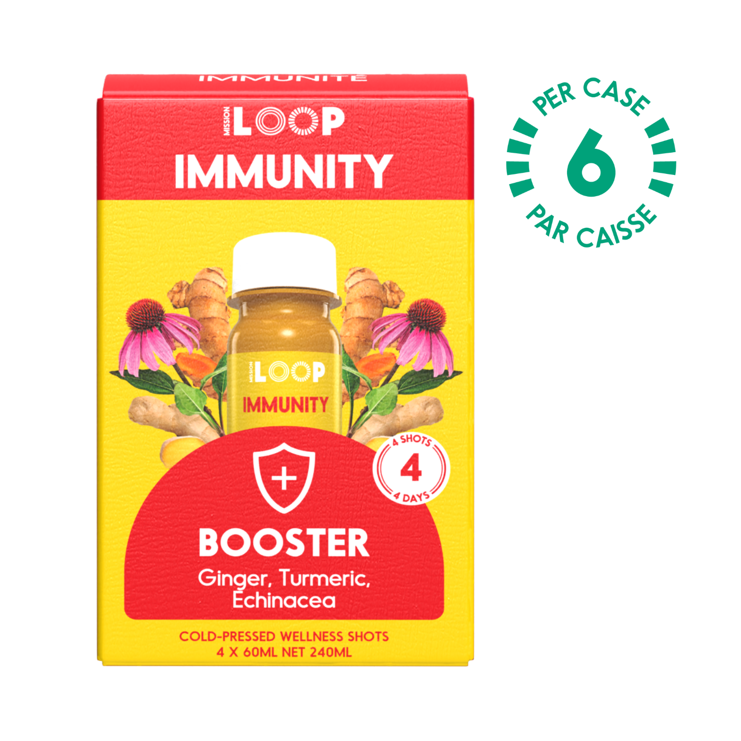 Gingembre, Curcuma, Echinacée, CitronUn boost puissant avec notre mélange de gingembre, curcuma, échinacée et citron. Juste ce qu’il faut de piquant pour vous et vos clients.- Défense immunitaire - Anti-inflammatoire - 1g de sucre Garder réfrigéréDurée de vie : 120 jours4 bouteilles par Pack6 Packs par caisse